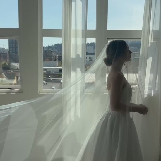 Lightweight luxurious tulle drapes beautifully from the comb down to a more voluminous shape. This extra long blusher creates a dramatic walk down the aisle and absolutely stunning wedding photos! is is a great option for brides wanting the traditional veil look. Second layer can be worn over the face or behind the head. Blusher is 52 inches long and will land between your knees and your ankles depending on your height and where the veil is placed in your hair. Hand sewn on to a metal comb for easy placement.