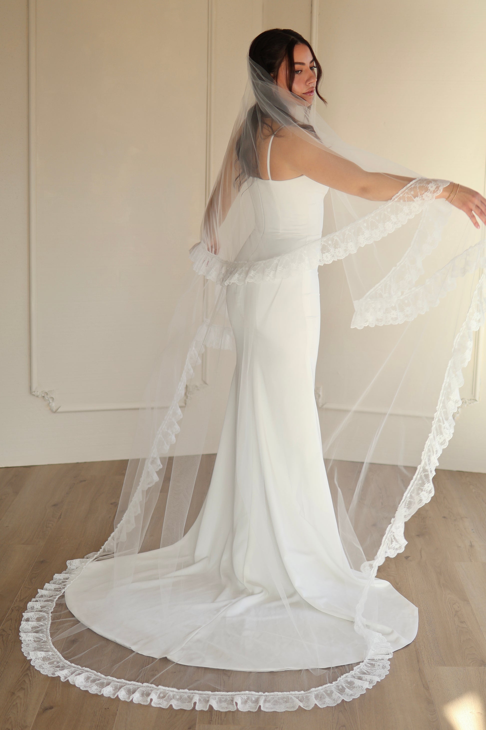 Our romantic Ruffle  Lace Drop Veil, featured delicately pleated lace sewn all around the edge of the veil. The intricate lace detailing cascades gently down around the sides of the veil creating a wave like silhouette. This veil can be worn with the blusher over your face for a show stopping aisle moment or behind your head for a double layered look. Perfect for creating stunning bridal portraits, lace is a must have for the modern yet timeless bride.