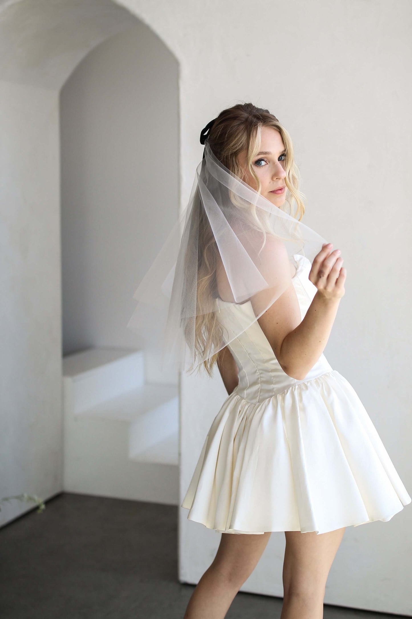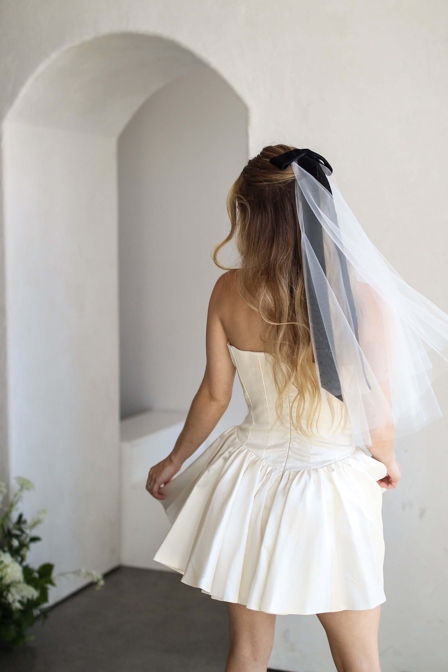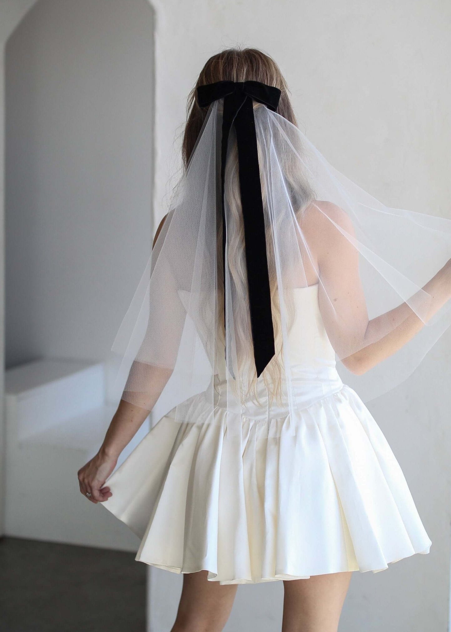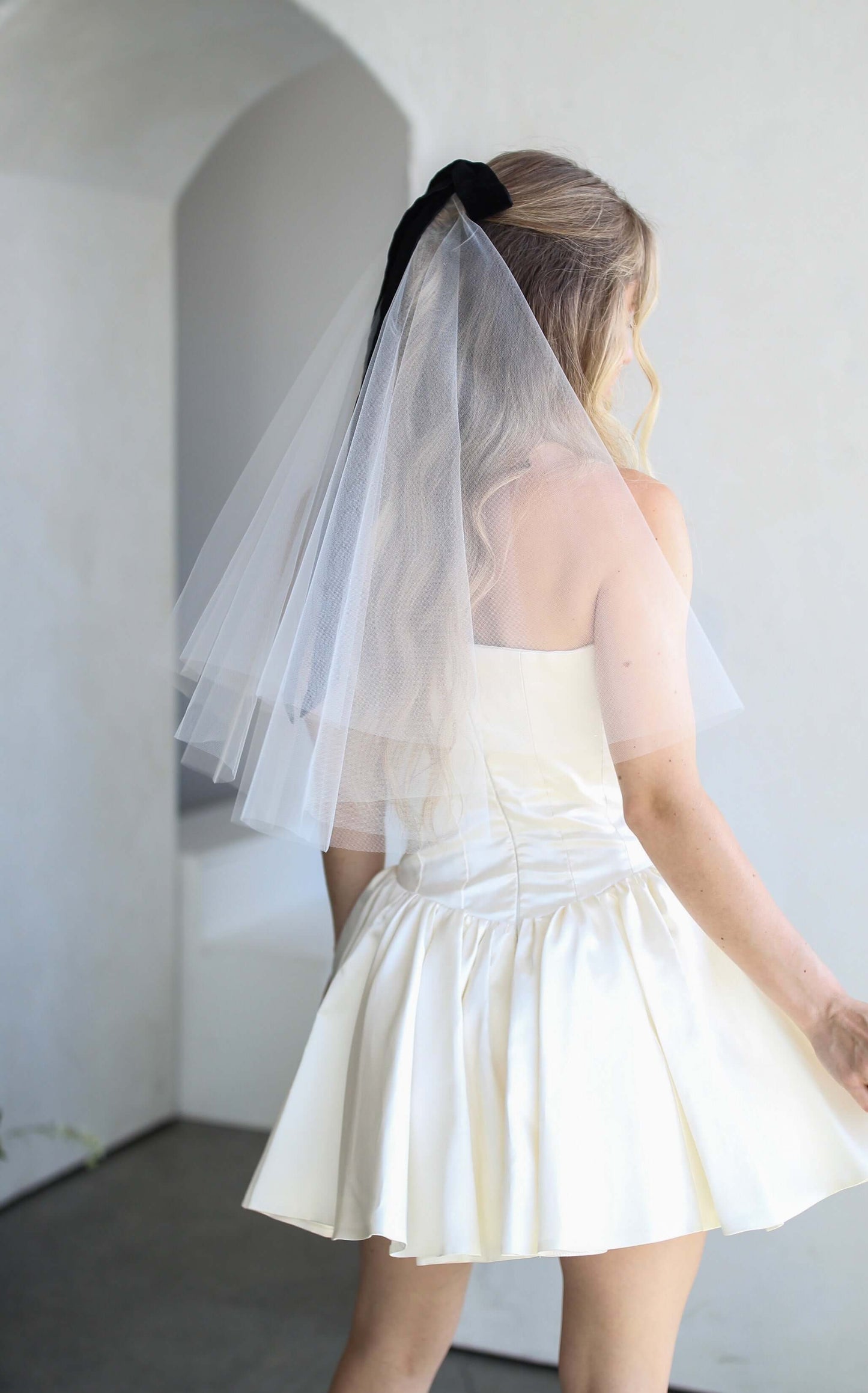 This double layer tulle veil with a black velvet bow is a whimsical and feminine wedding day look! Lightweight tulle fabric drapes beautifully from the comb down to a more voluminous shape on the bottom. The veil is completed with a luxurious velvet double bow which can be made detachable so you can wear it separately!