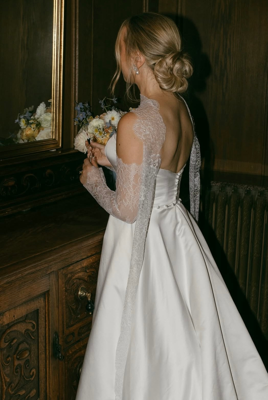 A gorgeous bridal accessory to complement your wedding day look. Our delicate lace neck scarf drapes across your neck and down your back and can be styled in multiple ways. The intricate eyelash lace scallops perfectly accentuate your color bone while adding a touch of vintage glam to your look. We love pairing this scarf with strapless wedding dresses!