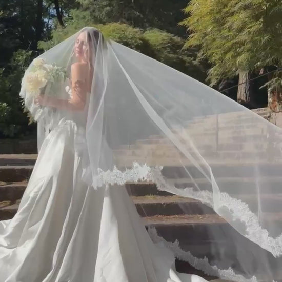 Our romantic Lace Drop Veil is exquisitely crafted from soft, ethereal bridal tulle and lined with delicate chantilly lace. The intricate lace detailing cascades gently down around the sides of the veil creating a luxurious silhouette. This veil can be worn with the blusher over your face for a show stopping aisle moment or behind your head for a double layered look. Perfect for creating stunning bridal portraits, lace is a must have for the modern yet timeless bride.