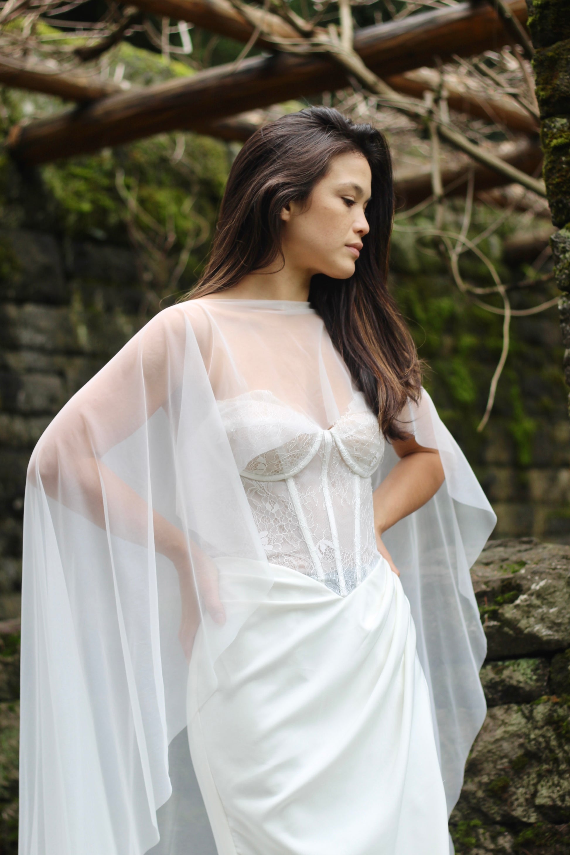 Perfect for brides seeking a timeless yet contemporary accessory, this capelet drapes effortlessly over any gown, offering just the right amount of coverage without hiding your dress's beautiful details. Featuring a raw edge to create a seamless look.